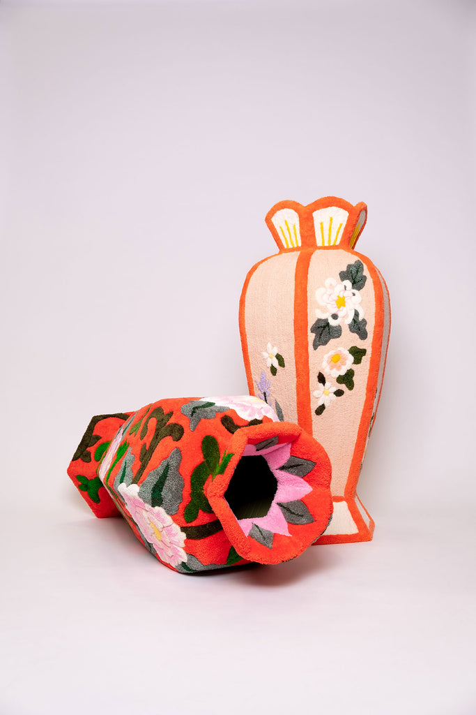 Her colorful universe of work includes “fluffy”, hand-tufted vases inspired by traditional Chinese vases, tapestries and rugs which stand out as much for their vivid colors and floral and tribal motifs