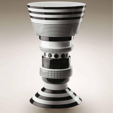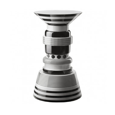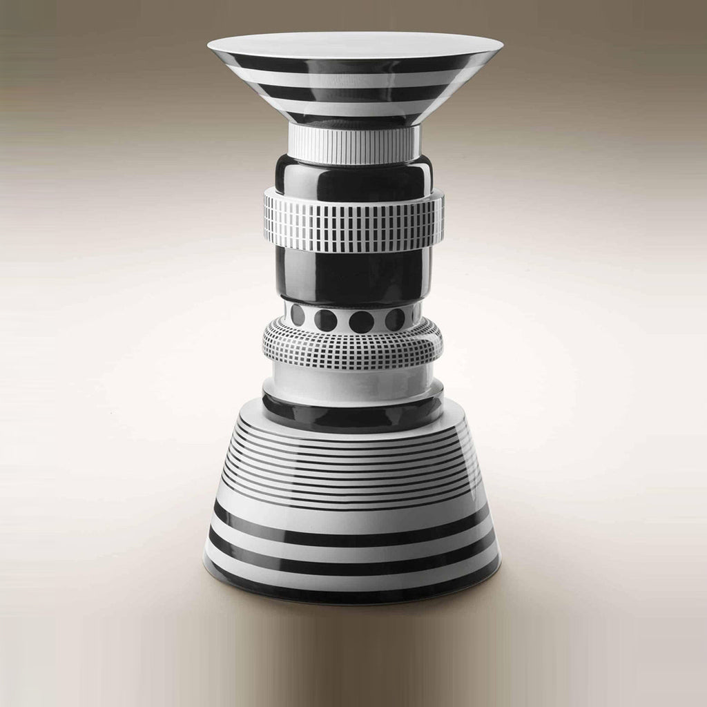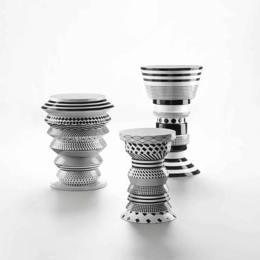 Overlapping geometric modules compose side tables in different shapes, small tribal totems that play with a kaleidoscope of colors or the black and white contrast of patterns and decorations.