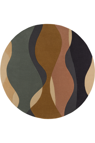 The multi-colored handwoven wool rug called "Océane" features a curved pattern that evokes the movements of the seabed with changing hues..