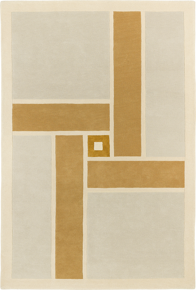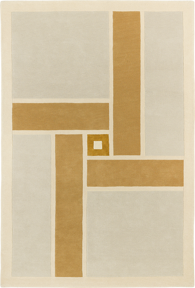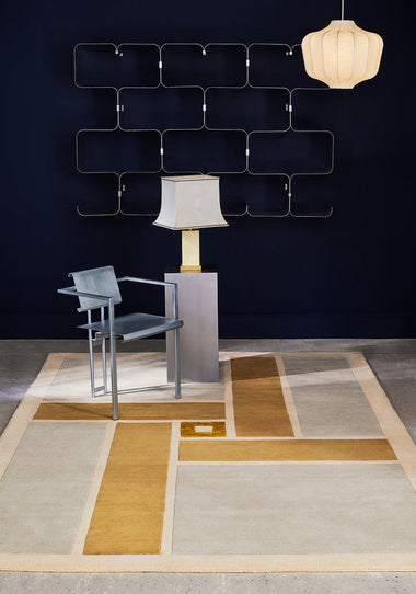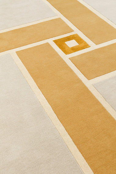The hand-tufted red wool and viscose rug has a symmetrical and centered shape, heavily influenced by the glamorous Italian design of the 70s. Geometric in nature, it consists of colored lines and surfaces, decorated with a bright central point. It is available in a variety of sizes, square or rectangular, and can even be turned into a hallway rug or bedside rug.